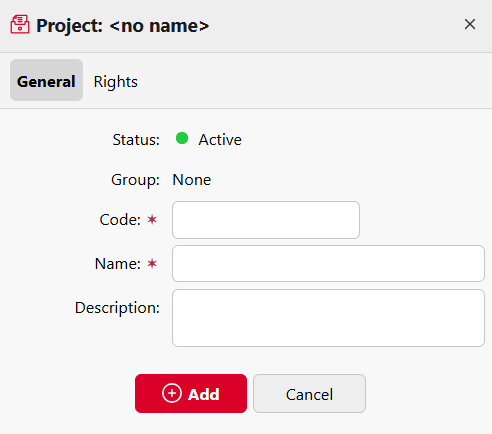 En la barra de la parte superior del Proyectos pestaña principal, haga clic en +Añadir proyecto. El panel de propiedades del nuevo proyecto se abre en la parte derecha de la pantalla.