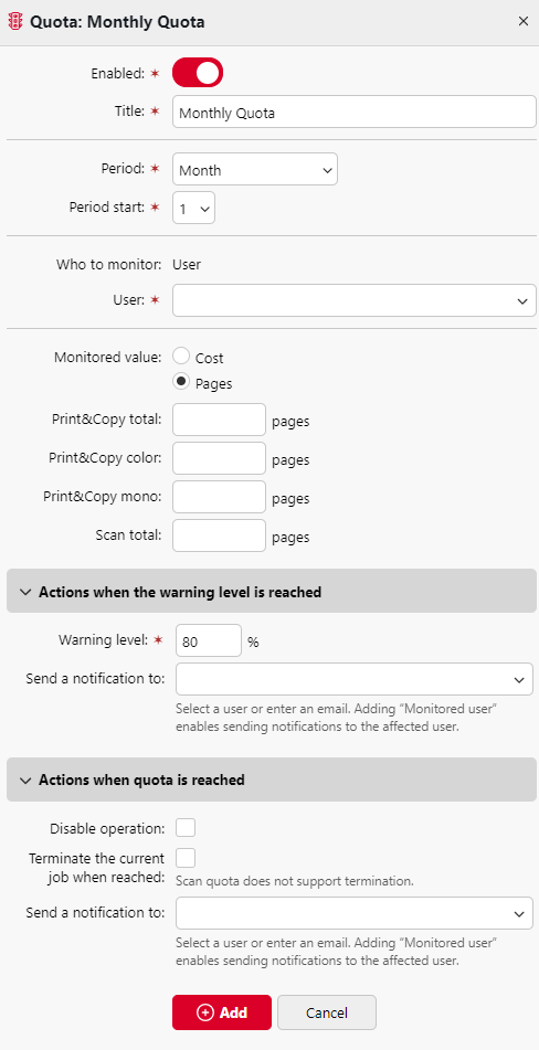 Si selecciona Páginas como el Valor controladoLa cuota se contabiliza en la cantidad de páginas impresas, copiadas y/o escaneadas.