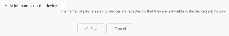 Además, puede activar o desactivar la opción de Ocultar los nombres de las tareas en el dispositivo. Activar esta opción significa que los nombres de los trabajos liberados a los dispositivos se redactan para que no sean visibles en el historial de trabajos del dispositivo.