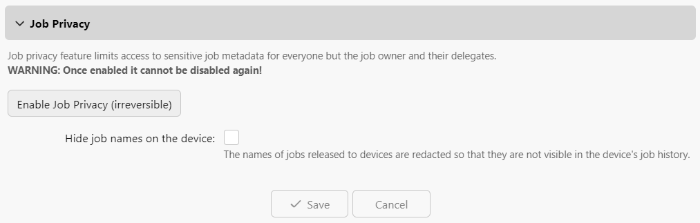Aquí puede activar el Privacidad laboral que limita el acceso a los metadatos confidenciales de los trabajos a todo el mundo excepto al propietario del trabajo y a sus delegados.