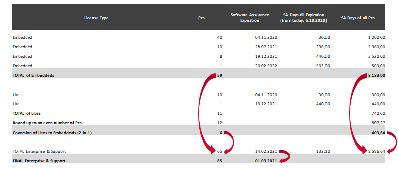 (por ejemplo, tiene 100 x Embedded (E) y 200 x Embedded Lite (EL) | por lo que 100 x "fecha de caducidad" de (E) + 200/2 x "fecha de caducidad" de (EL)) / recuento de ((E) + (EL/2))La media calculada es un número real y, convertida de nuevo al formato de fecha puede producir, por ejemplo, 23h:56min - por esta razón se añade 1 día.