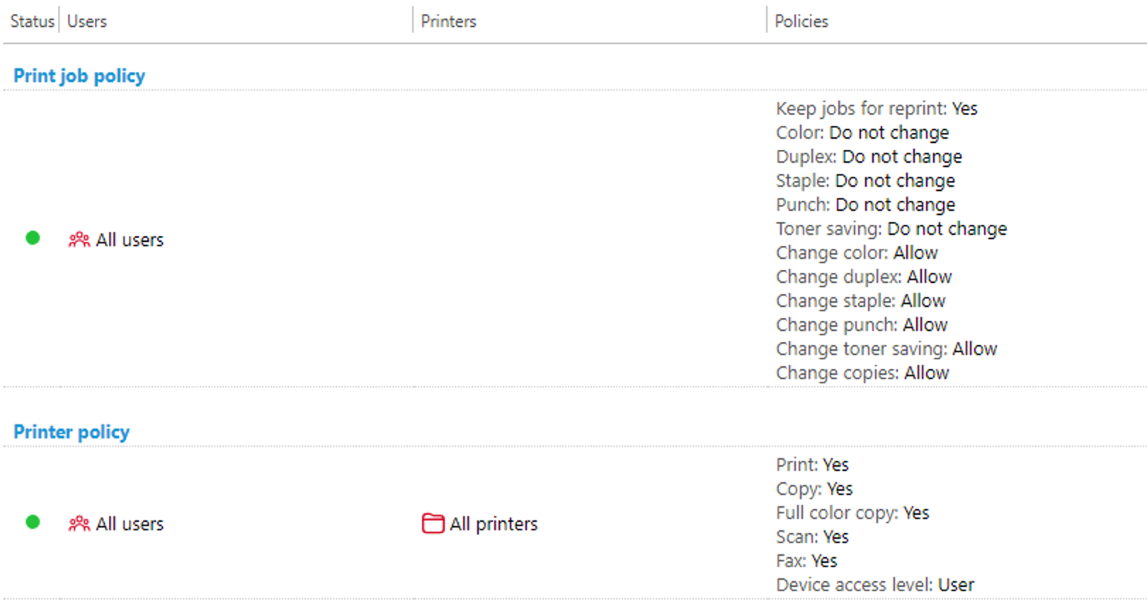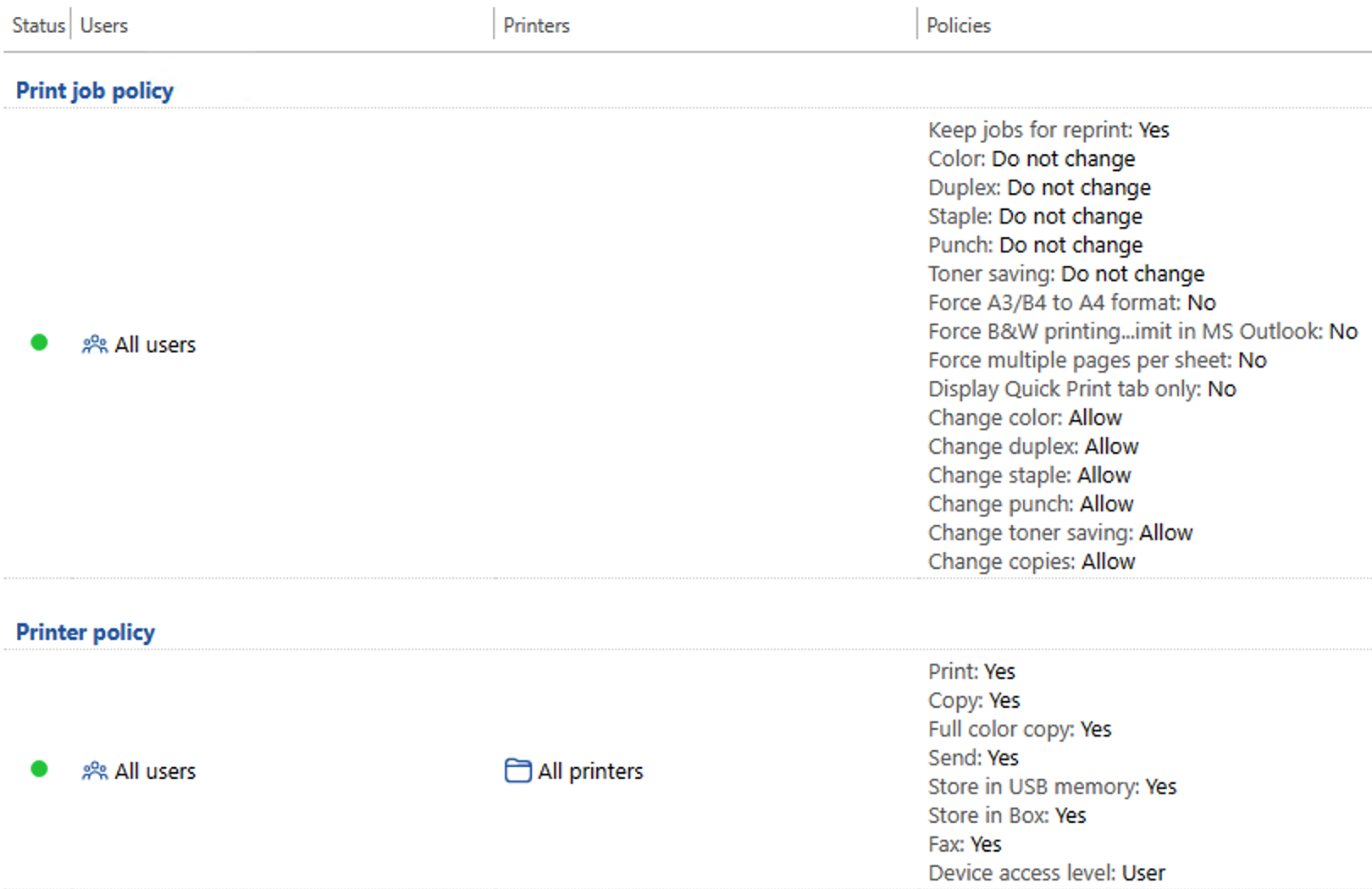 Actualmente, KNM y aQrate tienen una lista ampliada de políticas de usuario por defecto en comparación con MyQ - una política se sustituye por varias otras políticas adicionales, ver capturas de pantalla. Así que durante la migración a MyQ, las políticas adicionales se eliminan y respectivamente se añade una política que falta con su valor por defecto seleccionado. Las demás políticas y sus valores no se modifican durante la migración.