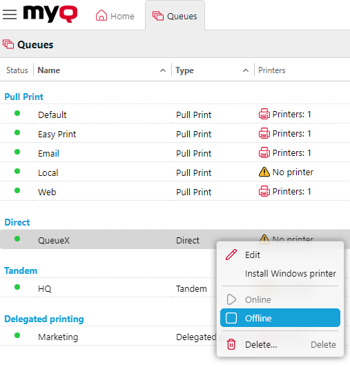 En el cuadro desplegable Acciones, haga clic en Fuera de línea (o En línea). La cola pasa al modo fuera de línea o (modo en línea).