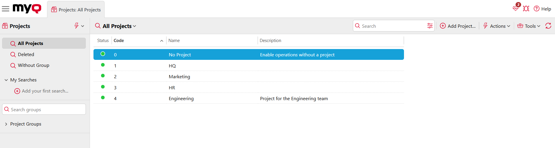 Con la función de contabilidad de proyectos activada, los usuarios pueden asignar trabajos de impresión, copia y escaneado a proyectos concretos y, en consecuencia, distribuir el coste de impresión entre los proyectos y cargarlo adecuadamente. La contabilidad de proyectos también puede utilizarse como otro nivel independiente de contabilidad interna además de los dispositivos, usuarios y grupos. Los proyectos pueden crearse manualmente en la interfaz web de MyQ o importarse desde un archivo CSV. Pueden asignarse a trabajos de impresión en la ventana emergente de MyQ Desktop Client, en la interfaz web de MyQ, en un terminal integrado, en un panel táctil de un terminal HW o en la aplicación MyQ X Mobile Client.