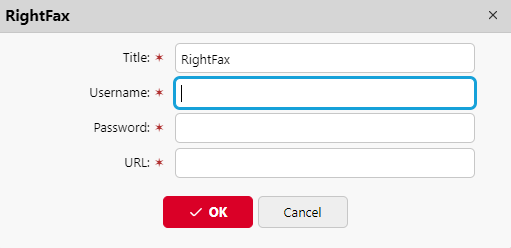Introduzca un Título que identifica la conexión, y proporcione a su administrador de RightFax Nombre de usuario, Contraseña, y URL de la forma
