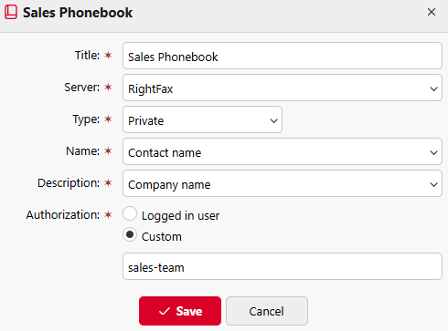 En el ejemplo siguiente, equipo de ventas es una cuenta en la instancia de RightFax conectada. Cuando esta libreta de códigos se utiliza como destino de Easy Scan, los usuarios del terminal sólo pueden enviar un fax a los contactos del equipo de ventas. Además, al seleccionar contactos, los usuarios verán el nombre del contacto y la empresa, pero no el número de fax del contacto.