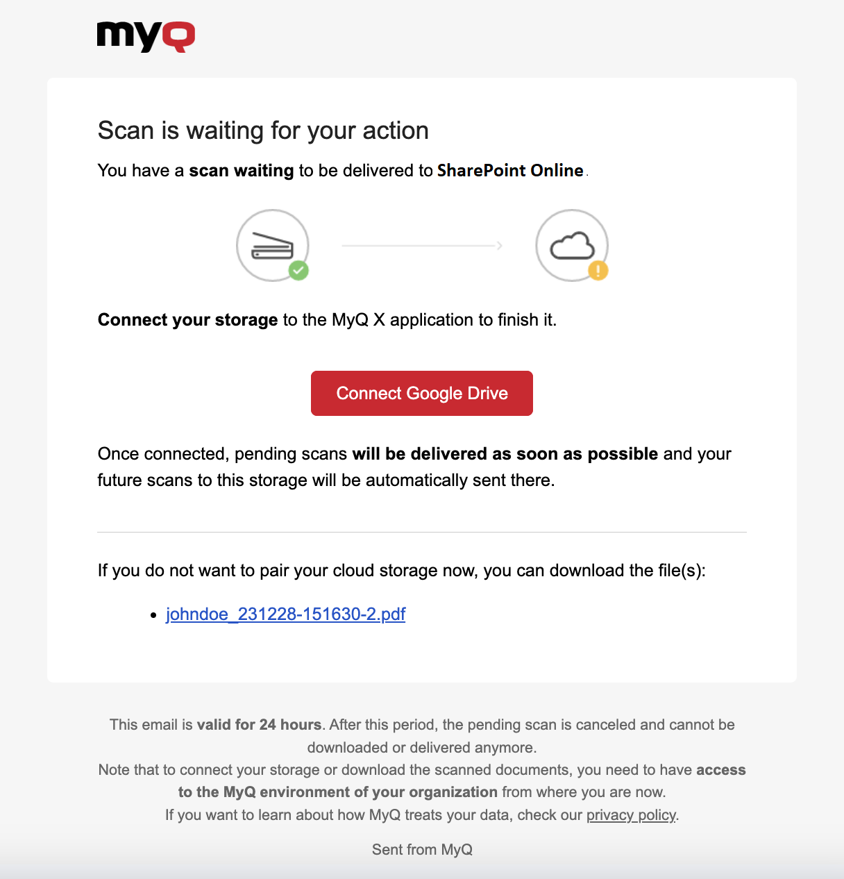 Se enviará un correo electrónico a la dirección de correo electrónico de los usuarios permitiéndoles conectarse a SharePoint Online, después de lo cual sus documentos escaneados serán entregados allí. Este correo electrónico es válido durante las 24 horas posteriores a la digitalización. Este correo electrónico también contiene un enlace seguro para descargar directamente los documentos escaneados.
