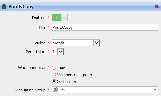 Por ejemplo: Hay dos cuotas aplicadas a un usuario. Ambas desactivan la impresión después de una determinada cantidad de páginas impresas: una después de cinco páginas impresas y la otra después de diez páginas impresas. Cuando el usuario imprime cinco páginas, se aplica la cuota más baja y no puede imprimir. La cuota se puede aumentar, lo que permite al usuario imprimir más páginas. Si se imprimen cinco páginas más, se aplica la cuota más alta.