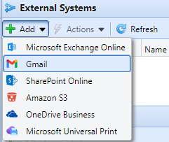En la sección Sistemas externos, haga clic en +Añadir y seleccione Gmail.