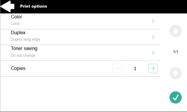 Editar: Pulse el icono de edición para editar las opciones de impresión de los trabajos seleccionados. En el Opciones de impresión en el cuadro de diálogo, dependiendo de los permisos otorgados por el administrador, el usuario puede seleccionar entre color o B/N, opciones de ahorro de tóner, opciones simplex/dúplex y cambiar el número de copias. Después de cambiar las opciones de impresión, el usuario puede tocar IMPRESO para imprimir los trabajos.