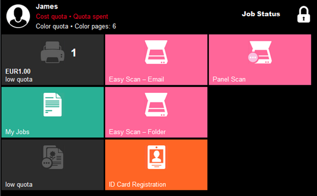 El comportamiento del terminal incrustado depende de la configuración de cuotas en MyQ. Al configurar Cuota en la interfaz del administrador de MyQ Web, puede desactivar una o varias operaciones una vez que se haya alcanzado o superado la cuota: