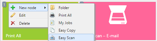 Los nodos de acción de los terminales se pueden gestionar en el Acciones terminales ficha de configuración (MyQ, Configuración, Acciones de la Terminal). Pueden ser gestionados bajo Pantalla de inicio en la lista de acciones o directamente en la vista previa de la pantalla del terminal.