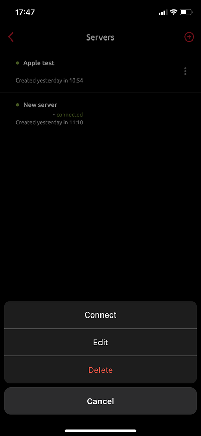 Para añadir un nuevo servidor, pulse el botón + (más) en la parte superior. En la nueva ventana, puede introducir la información del nuevo servidor manualmente (añadir un nombre de servidor, la dirección IP y el puerto) y tocar AÑADIR SERVIDOR, o puede pulsar ESCANEAR CÓDIGO QR.