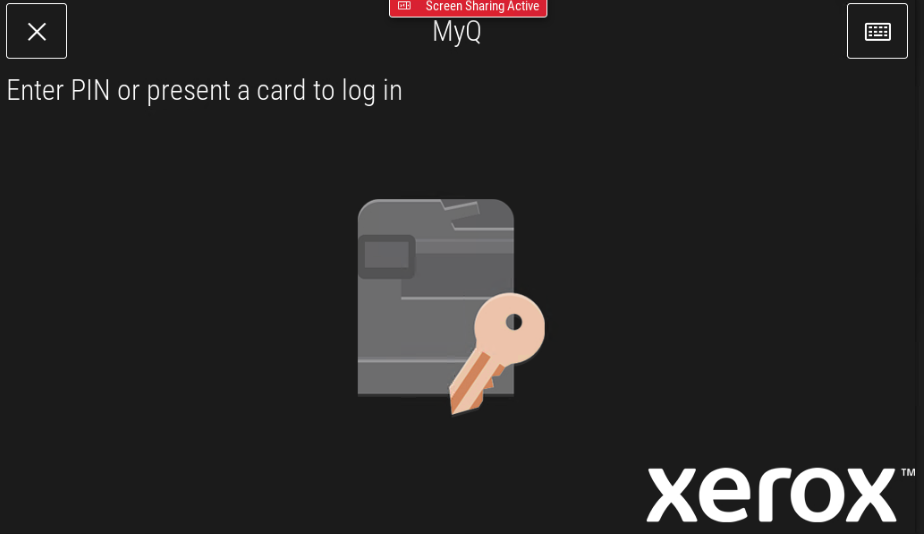 Para iniciar sesión en un terminal Xerox EIP 3.7 o Xerox EIP 4.0, los usuarios pueden pasar su tarjeta de identificación por el lector de tarjetas o pulsar el botón del teclado situado en la esquina superior derecha de la pantalla del terminal e introducir sus credenciales.