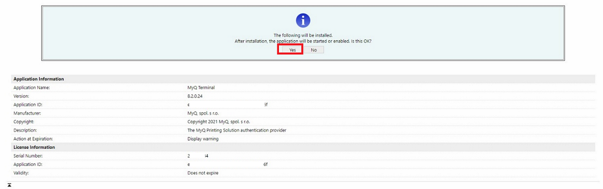 Pour l'installation, le numéro d'accès à la licence est nécessaire pour générer le fichier de licence, et l'application MyQ Terminal.jar est nécessaire pour l'installation sur l'interface web de l'appareil avec le fichier de licence généré.