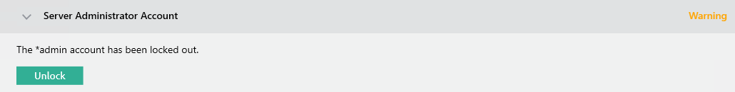L'administrateur peut voir un avertissement indiquant que le compte *admin est verrouillé, et le déverrouiller, dans la fenêtre de l'administrateur. Compte de l'administrateur du serveur section sur le Paramètres onglet. Une fois qu'ils ont cliqué sur Déverrouiller le compte est déverrouillé.