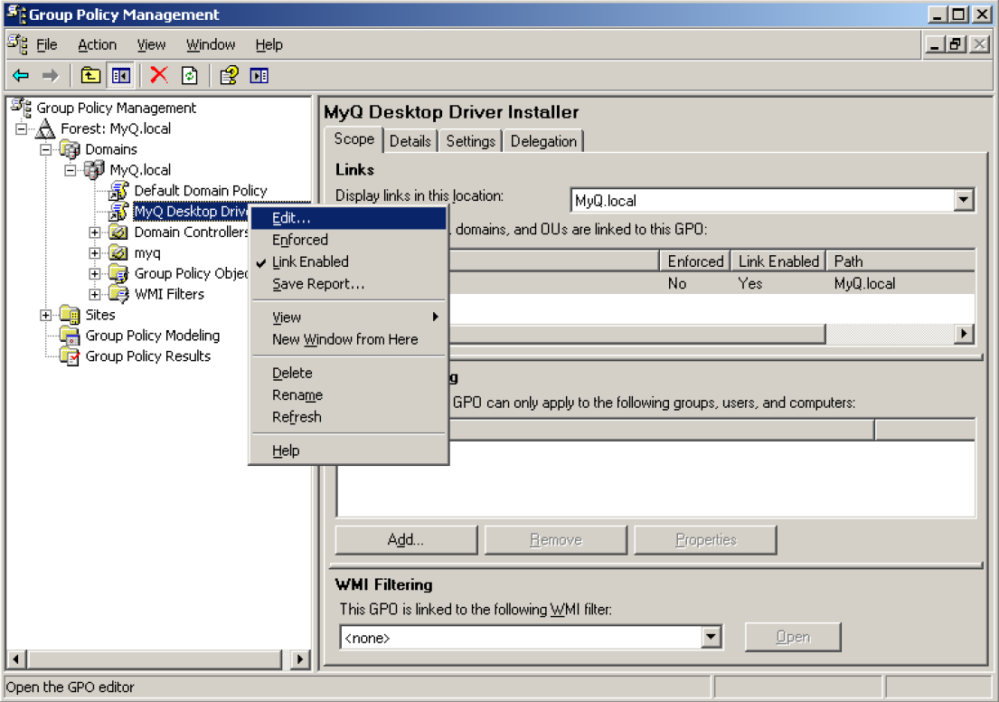 Sélectionnez à nouveau la GPO MyQ DDI que vous avez créée, et dans la section Filtrage de sécurité, définissez le groupe d'ordinateurs ou d'utilisateurs auquel vous voulez appliquer MyQ DDI.