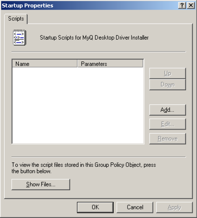 Fermez cette fenêtre et revenez à la fenêtre Propriétés de démarrage. Sélectionnez Ajouter... et dans la nouvelle fenêtre, cliquez sur Parcourir et sélectionnez le fichier MyQDDI.ps1. Cliquez sur OK. La fenêtre Startup Properties contient maintenant le fichier MyQDDI.ps1 et se présente comme suit :