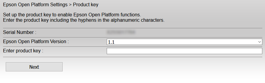 Sélectionnez le Version Epson Open Platform (la dernière version est préférable) et Entrer la clé du produit. Pour obtenir cette clé de produit, vous devez enregistrez votre périphérique d'impression auprès du service d'assistance Epson.