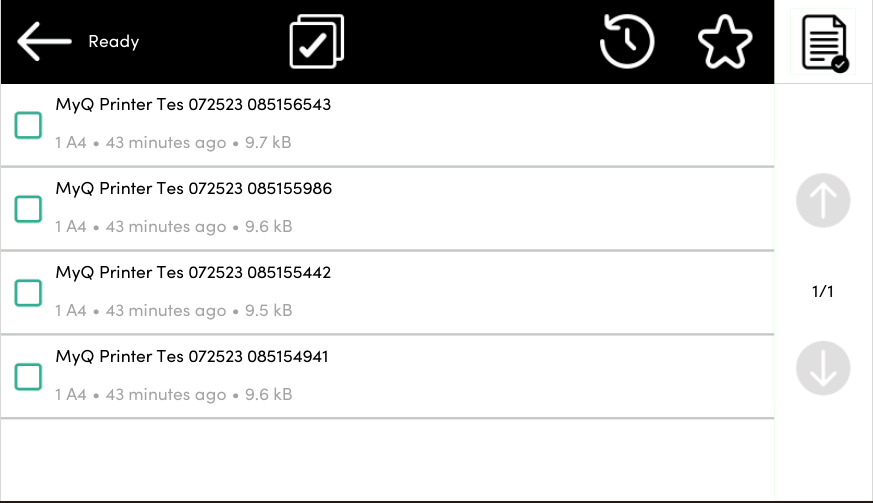 Cette action du terminal affiche tous les travaux qui peuvent être imprimés sur le périphérique d'impression. Les utilisateurs peuvent y gérer leurs travaux prêts, favoris et imprimés.