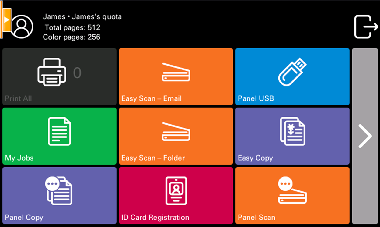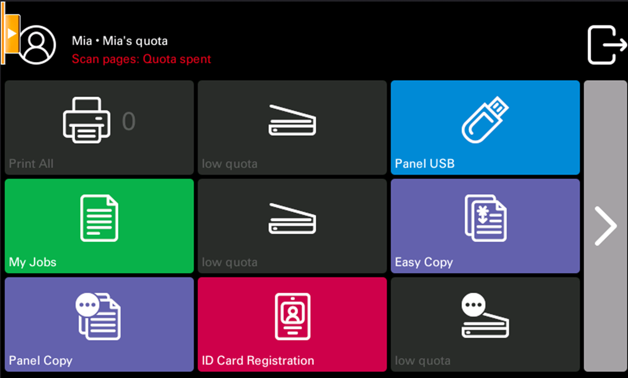 Avec la Quota activée, les utilisateurs ne peuvent plus imprimer, copier ou numériser lorsqu'ils ont atteint ou dépassé leur limite de quotas. Ils peuvent consulter leurs quotas actuels dans leur session sur le terminal embarqué.