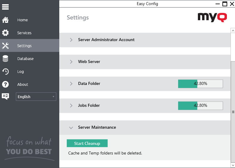 Dans le Maintenance du serveur de la section Paramètres vous pouvez nettoyer vos dossiers Cache et Temp. Cela peut être nécessaire dans les cas où des problèmes avec les fichiers temporaires affectent le système MyQ.