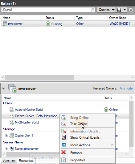 Pour prendre le Serveur Firebird - DefaultInstance hors ligne, ouvrez Failover Cluster Manager, allez à Rôles, cliquez avec le bouton droit de la souris sur le Serveur Firebird - DefaultInstance et cliquez sur Mise hors ligne dans le menu des raccourcis.