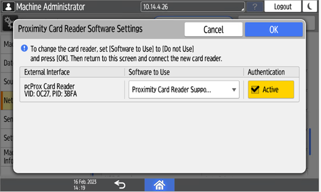 Sélectionner Non défini pour Paramètres du logiciel du lecteur de cartes de proximité.