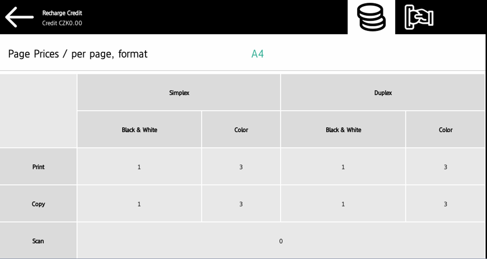 Les utilisateurs peuvent consulter les prix des différentes configurations d'une page imprimée en appuyant sur le bouton Pièces de monnaie dans le coin supérieur droit de l'écran.