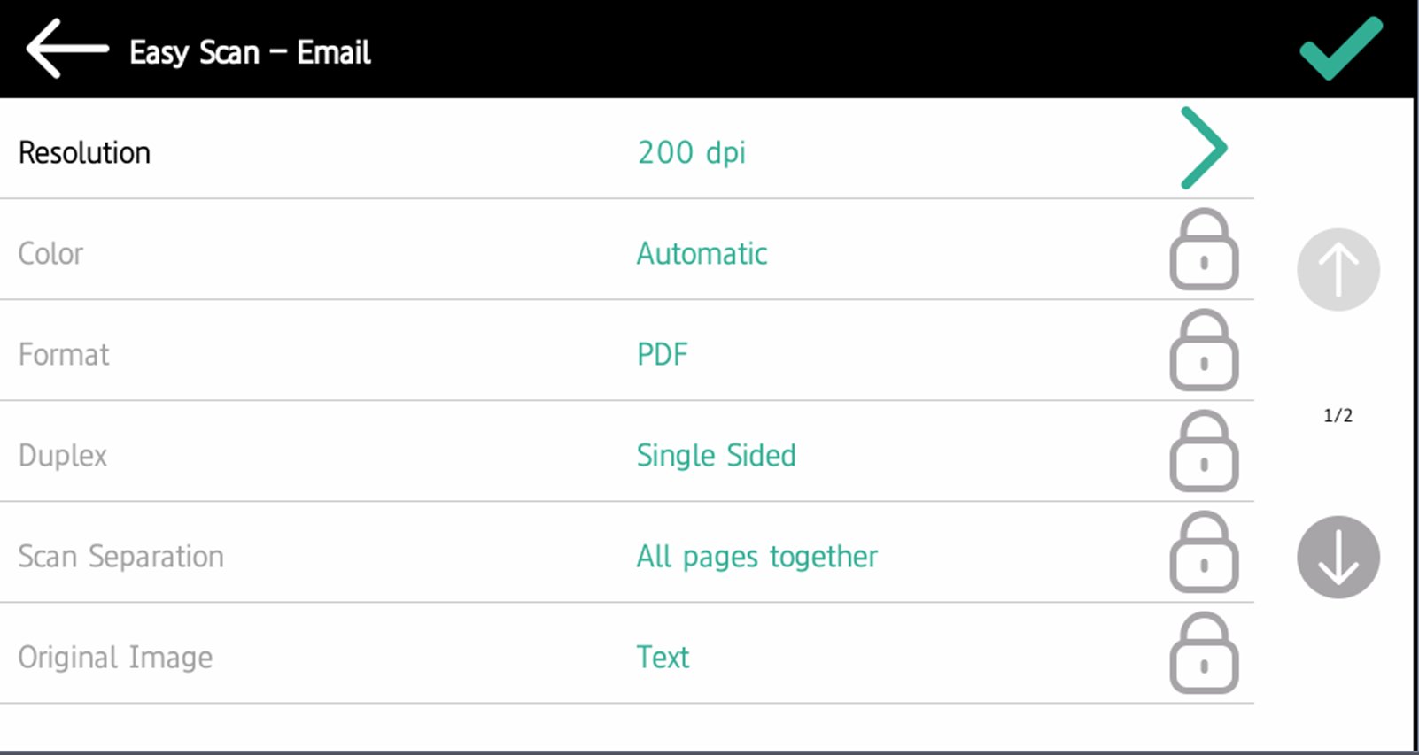 Si cette fonction est activée sur le serveur, les utilisateurs peuvent modifier leurs paramètres de numérisation à partir de l'écran du terminal.