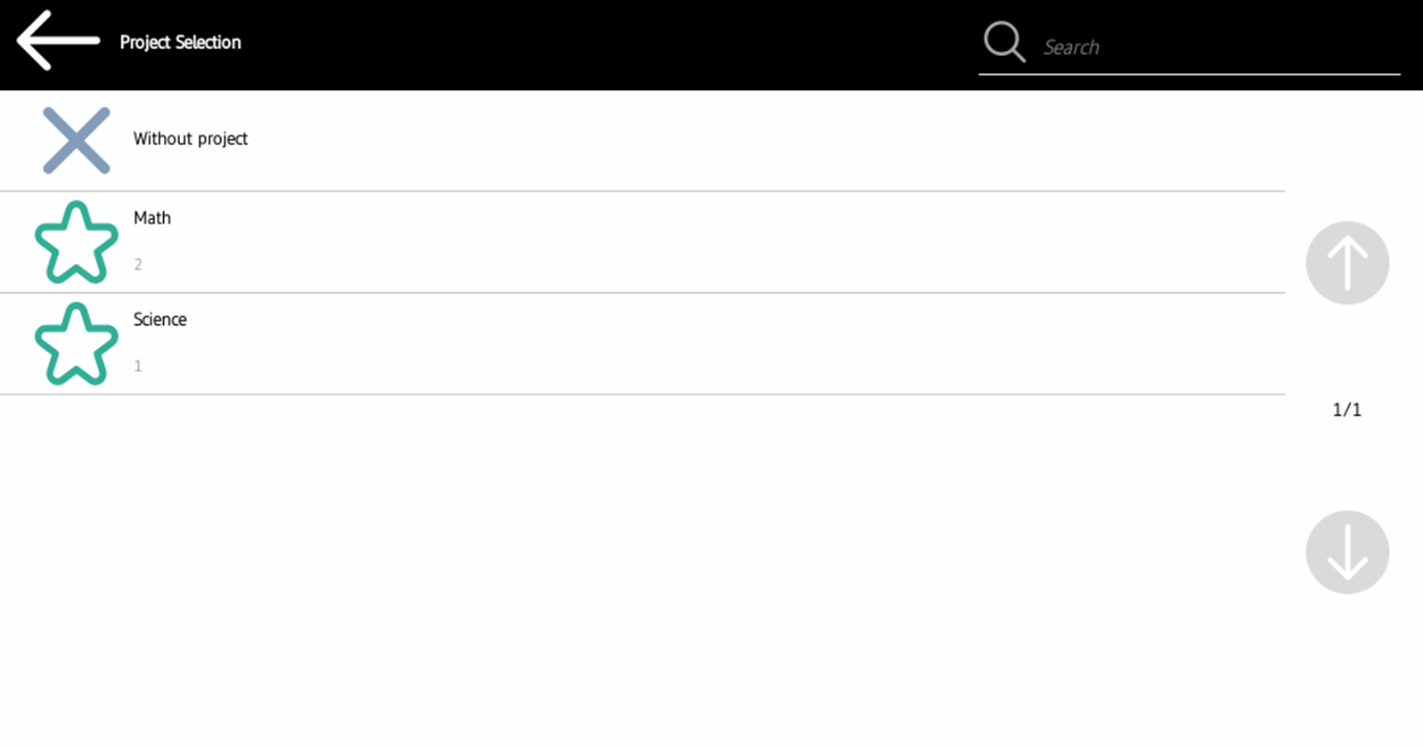 Après avoir appuyé sur la touche Scanner sur le bouton Balayage du panneau l'utilisateur est immédiatement redirigé vers l'écran de sélection du projet, où il doit sélectionner un projet (ou l'onglet Sans projet ). Le projet est alors attribué à tous les travaux numérisés sur le panneau.