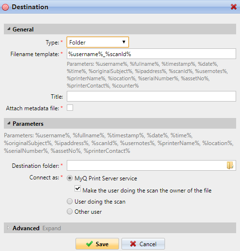Si vous sélectionnez le MyQ Print Server service les droits d'accès au dossier de destination doivent être accordés au compte sous lequel le service MyQ est exécuté. Ce compte sera également défini comme le propriétaire du fichier numérisé.