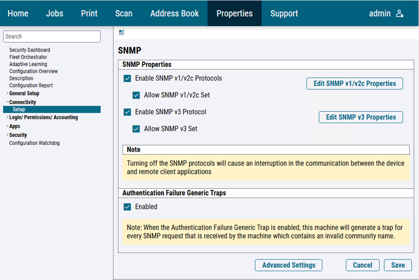 Si SNMP v2c est utilisé, la communauté SNMP de lecture et d'écriture doit être définie sur les valeurs déjà utilisées dans les machines. La valeur par défaut pour les machines Xerox est public pour lire et privé pour écrire.