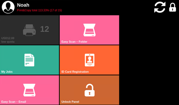 Avec la Quota activée, les utilisateurs ne peuvent plus imprimer, copier ou numériser lorsqu'ils ont atteint ou dépassé leur limite de quotas. Ils peuvent consulter leurs quotas actuels dans leur session sur le terminal embarqué.