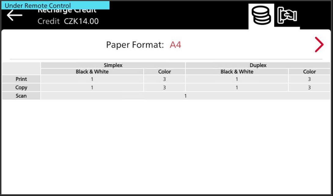 Users can view the prices of different configurations of a printed page by tapping the Coins in the upper-right corner of the screen.