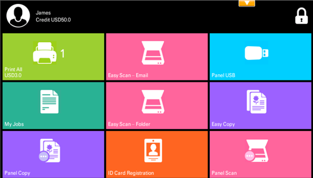 Con la contabilizzazione del credito attivata, gli utenti devono disporre di un credito sufficiente sul proprio conto per poter stampare, copiare e scansionare. Nella schermata iniziale del terminale incorporato, l'utente può visualizzare il credito residuo. Se il credito Credito di ricarica l'azione è disponibile sul terminale, gli utenti possono ricaricare il loro credito inserendo un codice da un voucher di ricarica direttamente su qualsiasi terminale incorporato.