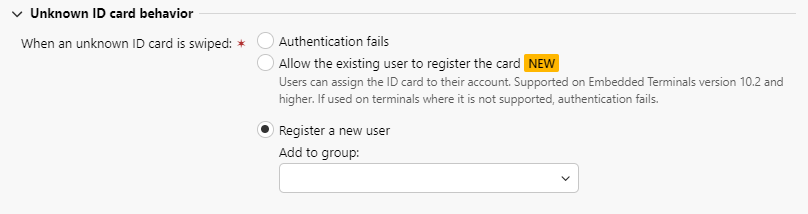 È possibile registrare un nuovo utente quando viene strisciata una carta d'identità sconosciuta. In Impostazioni > Utenti > Autenticazione utente > Carte sono disponibili le impostazioni per Comportamento sconosciuto della carta d'identità.