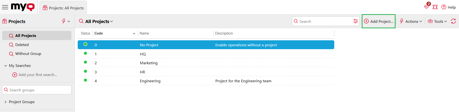 Per aggiungere nuovi progetti a MyQ, andare su MyQ, Progetti e: