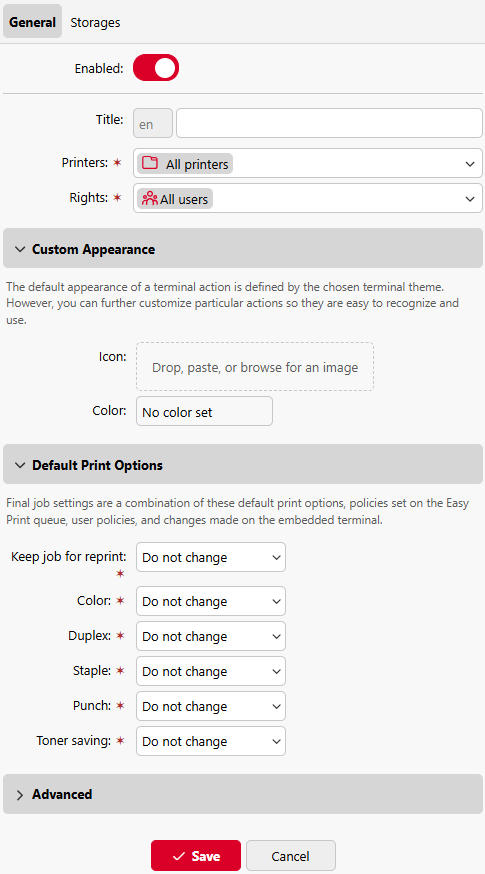L'azione del terminale Easy Print consente agli utenti di stampare i file senza inviarli prima a MyQ. I file possono essere stampati da più fonti, come diversi archivi cloud, unità di rete o unità locali e l'archivio predefinito dell'utente.