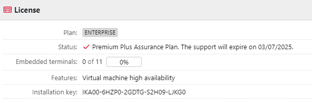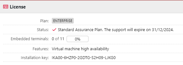È possibile visualizzare la licenza corrente nelle Impostazioni di licenza dell'interfaccia utente di MyQ o nel widget Licenze visualizzato sulla dashboard. Sono disponibili tre tipi di piani di garanzia: Standard, Premium e Premium Plus. Ulteriori informazioni sui piani di garanzia sono disponibili qui.
