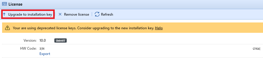 Vai a MyQ, Impostazioni, Licenza. Nella barra superiore, fare clic su Aggiornamento alla chiave di installazione.