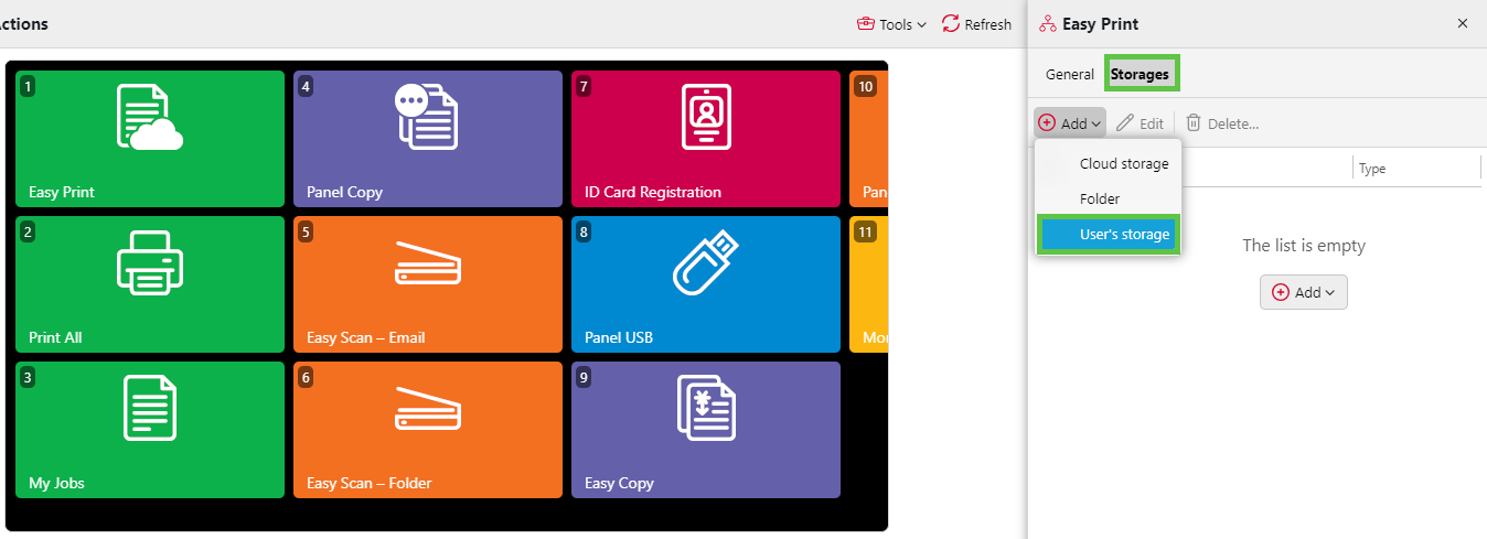 Se è già stata aggiunta un'azione Easy Print, è possibile configurarla facendo doppio clic su di essa o crearne una nuova facendo clic sul menu Azioni e poi su Aggiungere l'azione in questa cartella e selezionando Easy Print dall'elenco.