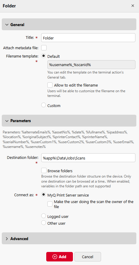 È necessario fornire l'accesso alla cartella di destinazione all'account con cui viene eseguito il servizio MyQ. Questo account verrà anche impostato come proprietario del file scansionato.Impostare l'utente che esegue la scansione come proprietario del file.