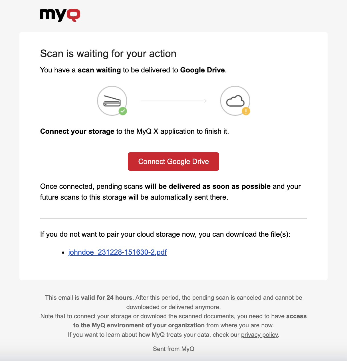 All'indirizzo e-mail dell'utente verrà inviato un messaggio di posta elettronica che gli consentirà di connettersi a OneDrive, dopodiché il/i documento/i scansionato/i verrà consegnato lì. Questa e-mail è valida per 24 ore dopo la scansione. Questa e-mail contiene anche un link sicuro per scaricare direttamente il/i documento/i scansionato/i.