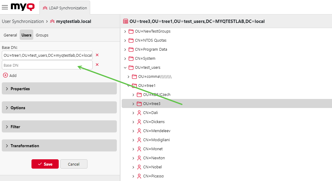 Sul Utenti selezionare uno o più DN (distinguished names) di base da cui importare gli utenti. Inoltre, è possibile assegnare gli attributi dell'utente dal server LDAP alle proprietà dell'utente in MyQ e selezionare altre opzioni relative alla sincronizzazione.