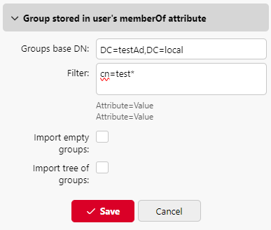 Importazione di gruppi vuoti: Se si seleziona questa opzione, i gruppi della Gruppo base DN vengono importati anche se non ci sono utenti che li hanno nella loro membroDi attributo.