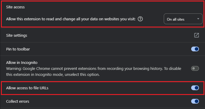 To function as expected, the extension must have permission to Allow access to file URLs and access On all sites in the extension settings. These settings are enabled by default.